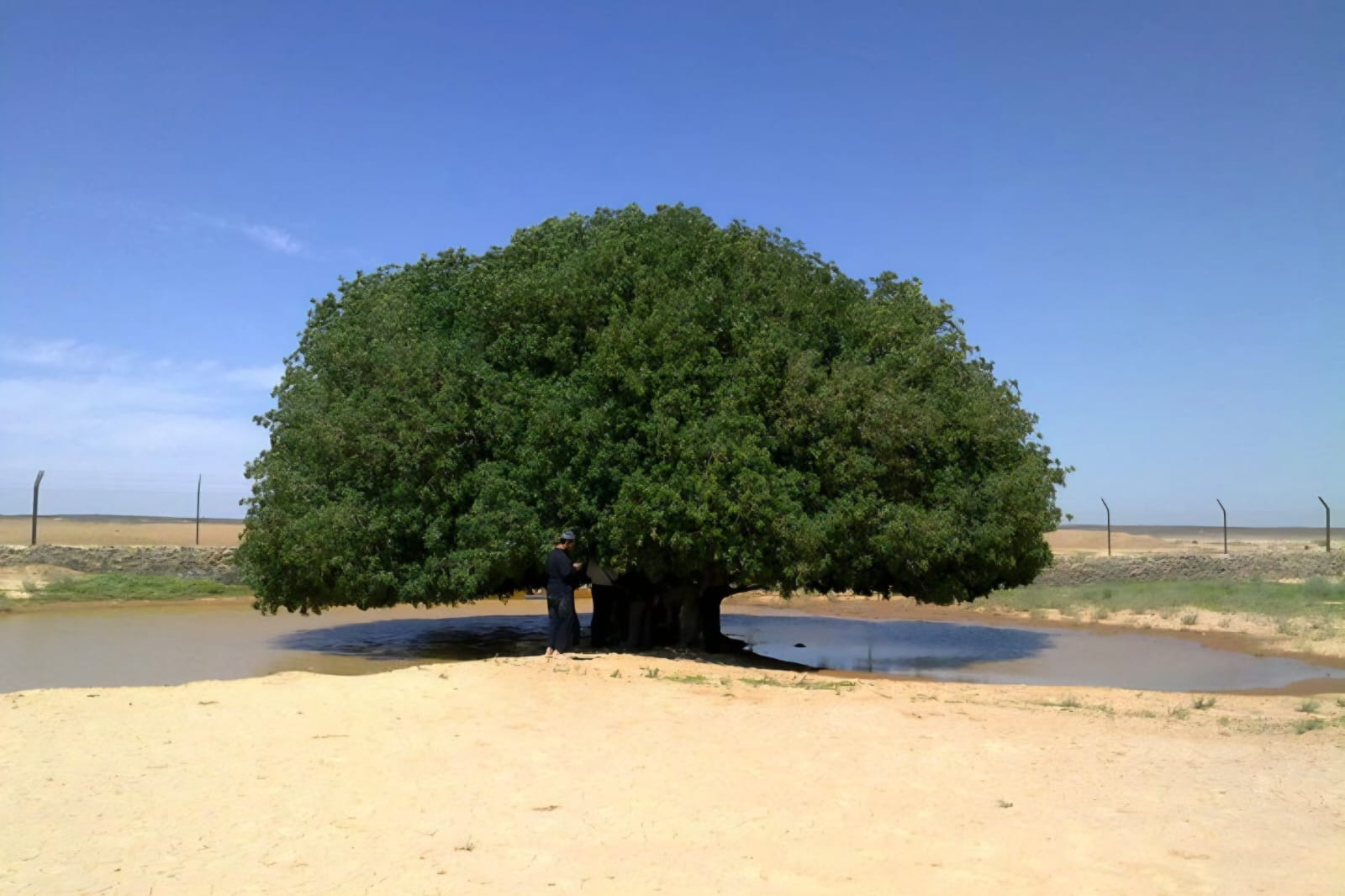​تحركت القافلة العربية تمخر عباب الصحراء ، تمضي في طريقها المرسوم حتى دخلت عمق البادية الأردنية في محافظة المفرق بالقرب من منطقة الصفاوي . وهناك ، في وسط تلك المفازة القاحلة ، وقفت شجرة عظيمة شامخة لتكون شاهداً على أعظم حدث تاريخي . إنها شجرة البقيعاوية ، وتُعرف اليوم أيضاً بشجرة الحياة أو الشجرة المباركة ، وهي شجرة من نوع البطم المعمر يقدر عمرها بأكثر من ألف وخمسمائة عام ، وتقف وحيدة كمعجزة ربانية في تلك الصحراء .