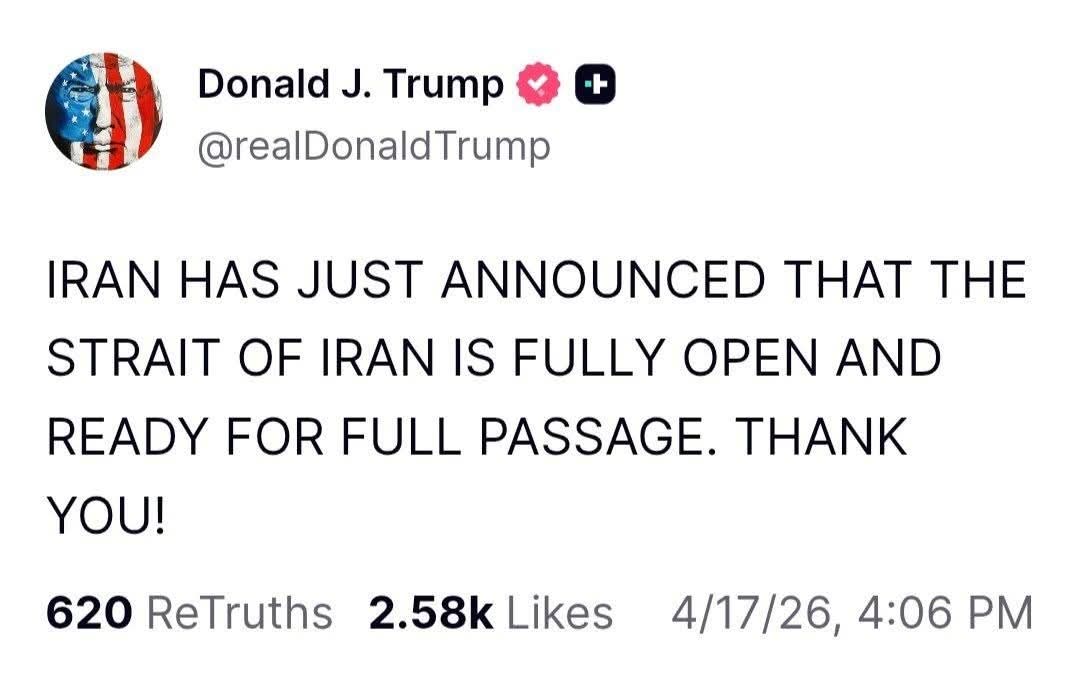 وأضاف ترامب في تغريدة عبر حسابه على "تروث سوشال": "إيران أعلنت للتو أن مضيق هرمز مفتوح بالكامل وجاهز للعبور التام.. شكرا لك".
