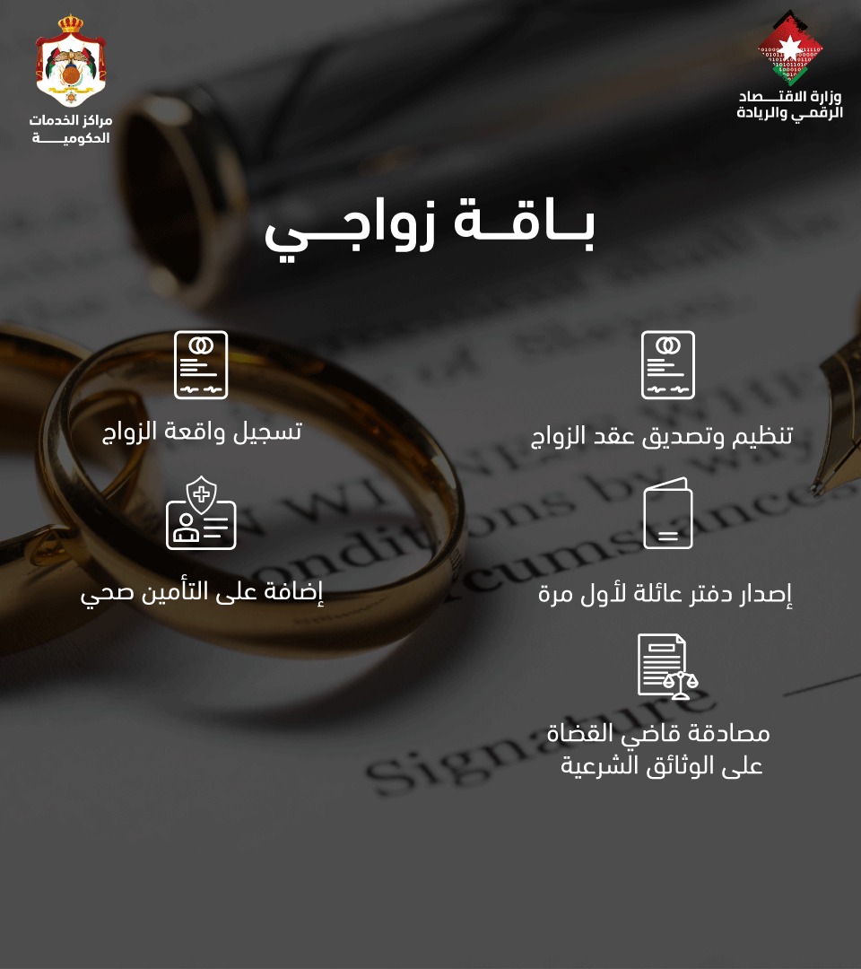 أعلنت مراكز الخدمات الحكومية عن إطلاق "باقة زواجي"، في خطوة تهدف إلى تبسيط وتوحيد إجراءات الزواج، وتمكين المقبلين على الزواج من إنجاز معاملاتهم في مكان واحد بسهولة ويسر.