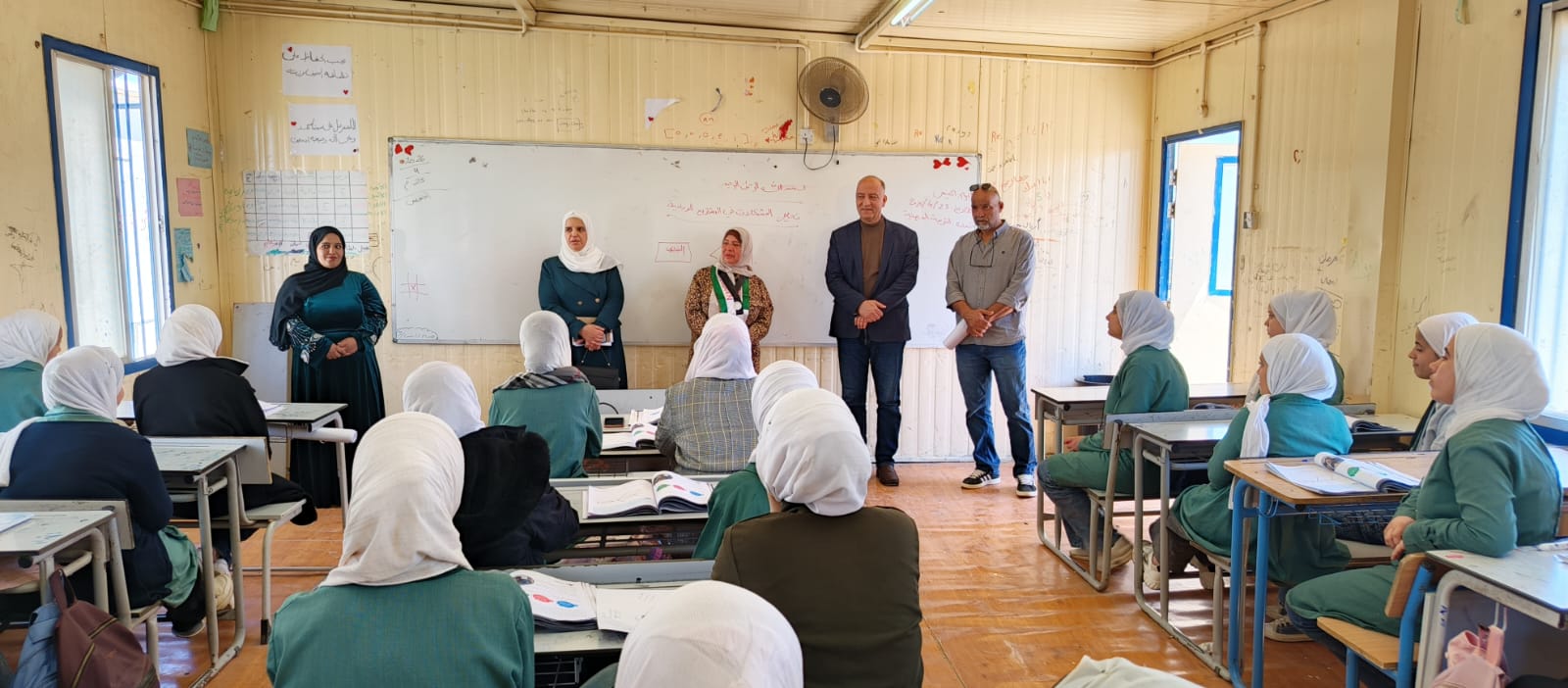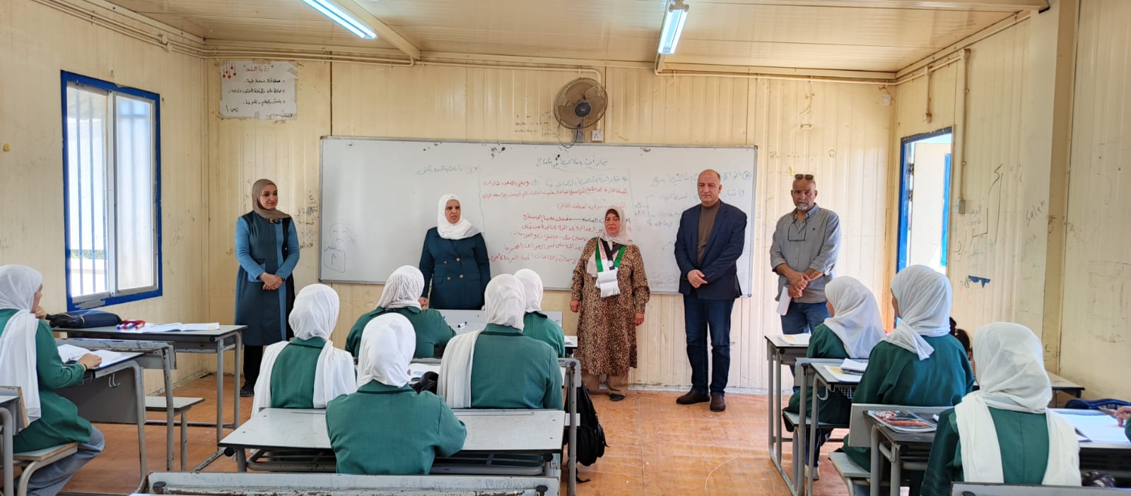 زارت مدير التربية والتعليم للواء البادية الشمالية الغربية الدكتورة منال الحويدي مدرستي خديجة بنت خويلد الأساسية للبنات وأم كلثوم الأساسية المختلطة / مخيم الزعتري، يرافقها منسق المخيم الأستاذ صالح القاضي ورئيس قسم الرقابة الداخلية الأستاذ أسعد ياسين، وذلك في إطار الزيارات الميدانية التي تنفذها المديرية لمتابعة سير العملية التعليمية في مدارس المخيم.